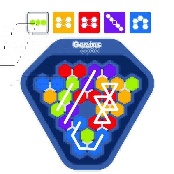 Genius Gems пропонує гравцям прийняти виклик і першими заповнити ігрове поле барвистими ігровими фішками. Але це ще не все! Genius Gems пропонує п'ять рівнів гри, кожен з яких стає все складнішим. Гравці можуть почати зі стартового рівня або спробувати пройти всі п'ять рівнів. Перший, хто розгадає рівень Чарівника, перемагає! Маючи понад 10 000 можливих комбінацій головоломок, Genius Gems пропонує безкінечний, швидкий та стратегічний ігровий процес.